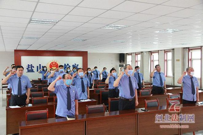 6月30日,盐山县人民检察院开展了庆“七一”主题党日活动,充分发挥党建工作引领作用,推动检察工作全面发展。图为该院党组书记、检察长石培德带领全体党员干警重温入党...