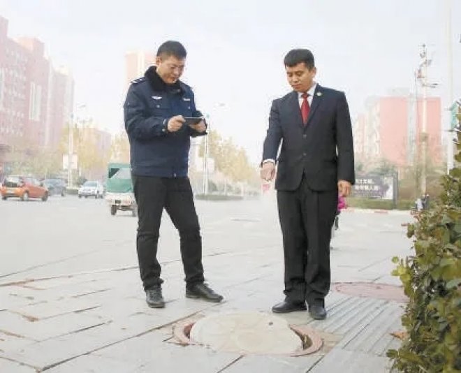 杜晓明(左)随同检察官排查时发现破损井盖后随即用手机拍下。 “大家都穿好制服,到我办公室来开个会。”刚上班,河北省阜城县检察院法警队队长杜晓明就在工作群里发了一...