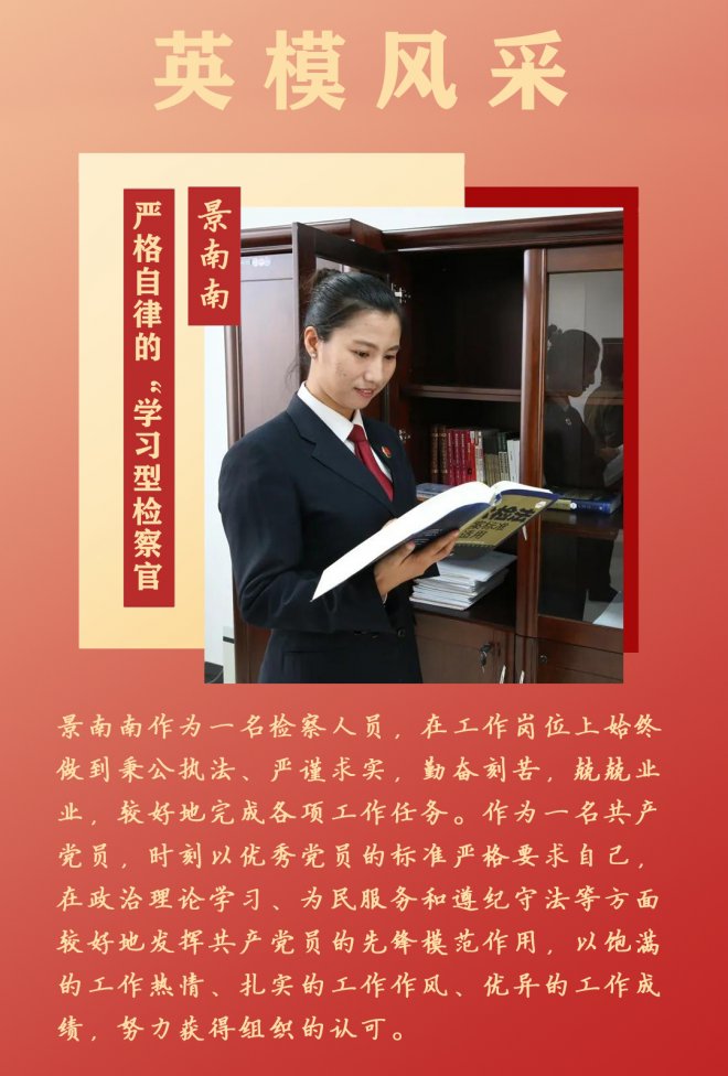 锤炼党性,成为“放心型”检察官 作为一名党员,景南南始终自觉坚持党性锻炼,持之以恒地加强政治学习,注重提高自己的政治修养,在大是大非面前保持政治上的清醒与坚定,...