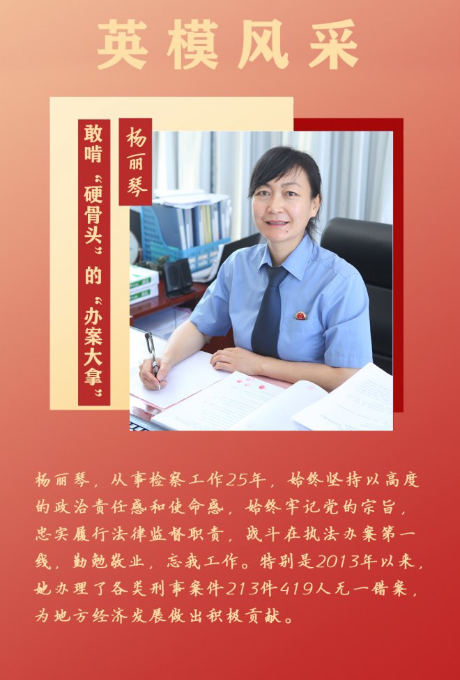 兢兢业业,敢于担当,捍卫公平正义 杨丽琴从事公诉工作已20个春秋。她忠诚履职、廉洁自律,她爱岗敬业、无私付出,用担当和奉献书写着无悔的检察人生。她常说:“公诉工...