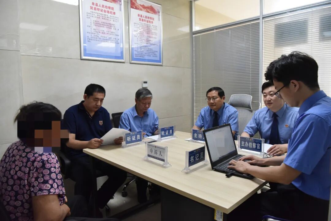 高氏代表丧母的杜鹃向单县检察院申请国家司法救助,图为简易听证会现场