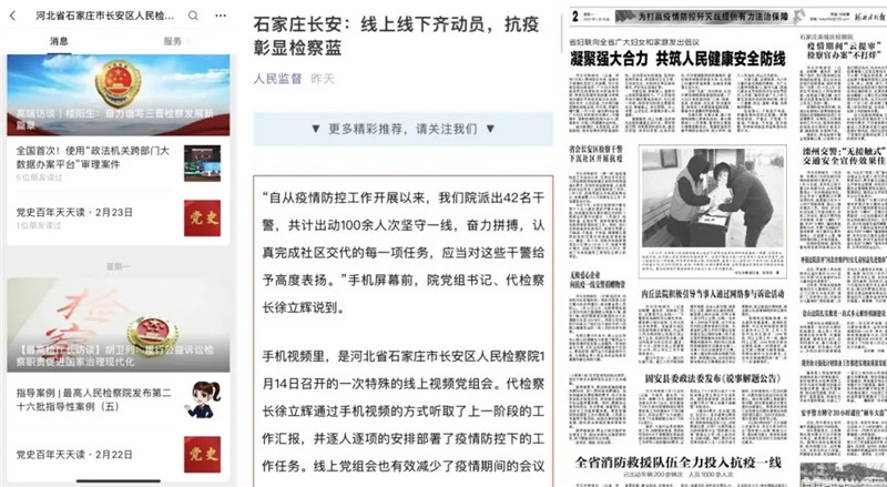 通过媒体、“两微一端”等方式,做好党建宣传工作,成立写作专班,狠抓稿件质量,畅通宣传渠道,检察日报、河北法制报、石家庄日报、正义网等媒体多次采用该院文章。同时,在该院微信公众号开辟“党史百年天天读”专栏,及时更新板块和内容,让党员利用业务时间能够潜移默化学习党史,净化心灵。