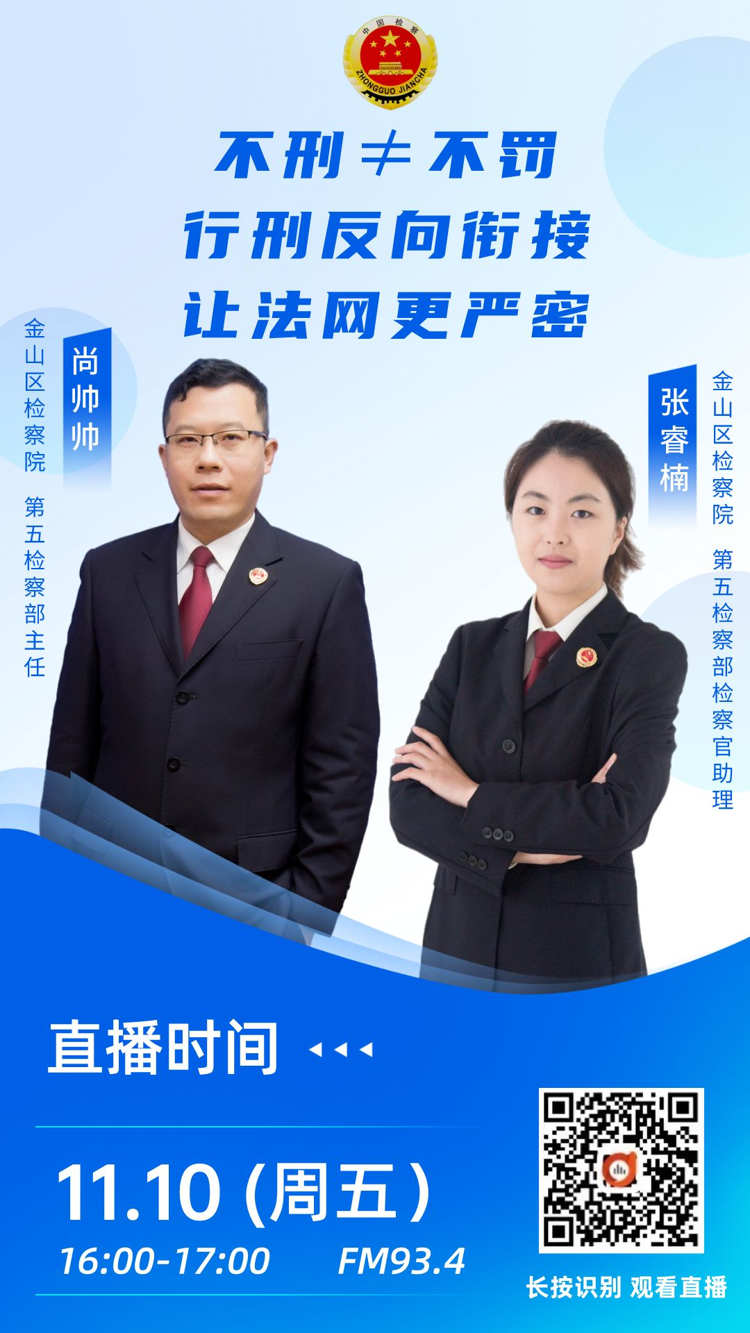 2023年11月10日下午4点,上海市金山区人民检察院第五检察部主任尚帅帅、检察官助理张睿楠将走进FM93.4上海新闻广播《法眼看天下》直播间,与您共同关注,敬请期待!